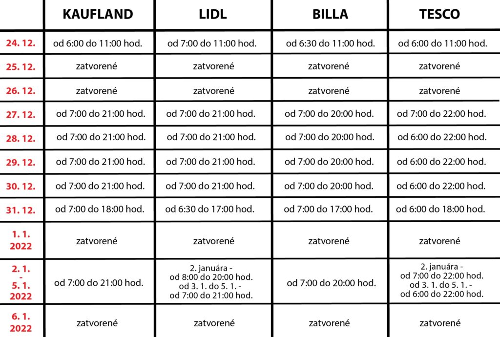 RIMAVSKÁ SOBOTA – Pripravili sme si pre vás prehľad otváracích hodín najväčších hypermarketov a supermarketov v meste počas vianočných sviatkov od 23. decembra až do 6. januára 2022. Prehľad nájdete nižšie.