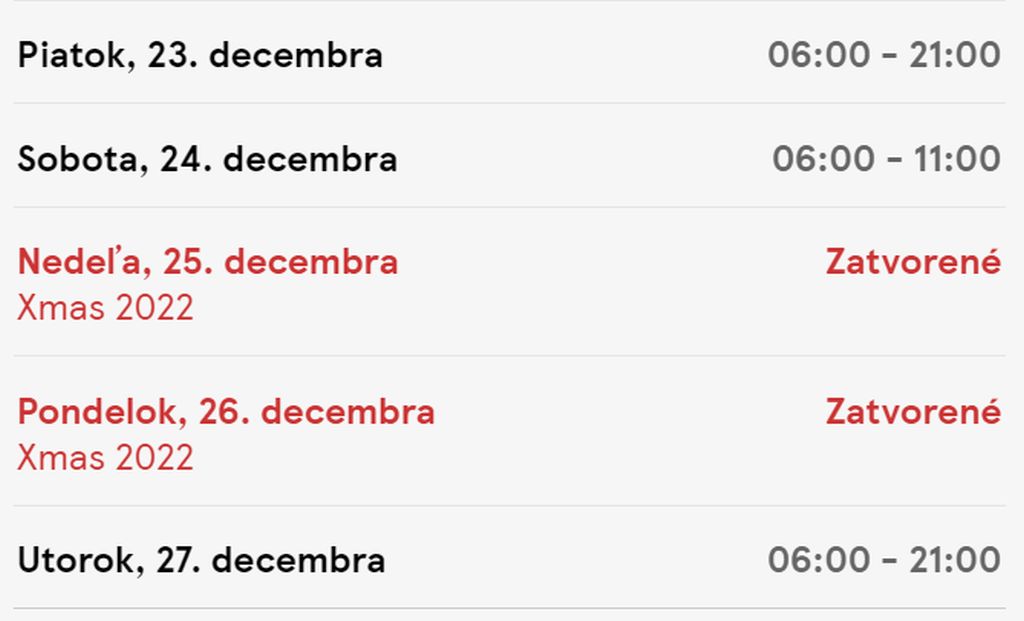 22. 12. 06:00 – 22:00 (bežná otváracia doba)