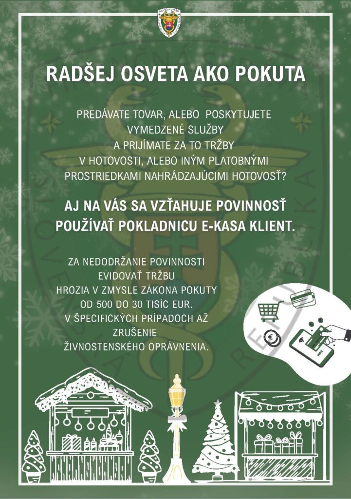 Podnikatelia sú povinní používať pokladnicu e-kasa klient a vystaviť zákazníkovi pokladničný doklad. Ten slúži ako potvrdenie o kúpe a dôkaz, že tržba bola riadne zaevidovaná. Kupujúci, ktorí sa stretnú s neúplným alebo podozrivým dokladom, môžu podnet nahlásiť cez aplikáciu e-Peňaženka alebo na email [email protected].