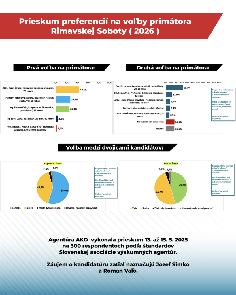 Agentúra AKO uskutočnila v dňoch 13. až 15. mája 2025 prieskum preferencií voličov pre nadchádzajúce komunálne voľby v Rimavskej Sobote, konkrétne pre voľby primátora mesta, ktoré sa budú konať v roku 2026. Na vzorke 300 respondentov vybraných podľa štandardov Slovenskej asociácie výskumných agentúr zisťovali, komu by dali svoj hlas. Záujem o kandidatúru zatiaľ verejne prejavili Jozef Šimko a Roman Vaľo.