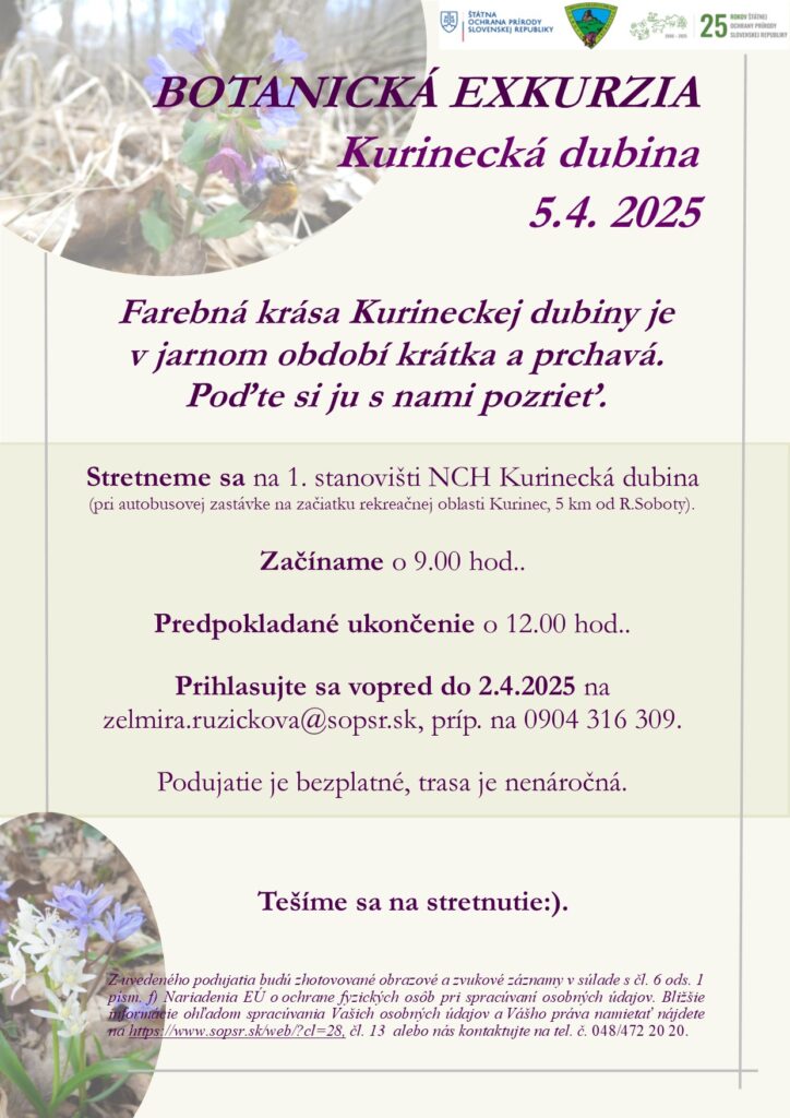 Exkurzia sa uskutoční v sobotu 5. apríla 2025 a začne sa o 9:00 na 1. stanovišti NCH Kurinecká Dubina, pri autobusovej zastávke na začiatku rekreačnej oblasti Kurinec. Trasa je nenáročná a predpokladaný čas jej ukončenia je 12:00.