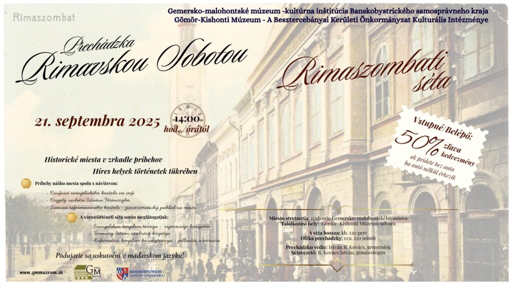 Okrem návštevy múzea čaká záujemcov aj tematické podujatie – Prechádzka Rimavskou Sobotou, ktoré sa uskutoční v nedeľu 21. septembra 2025 od 14:00 hod. Stretnutie účastníkov je naplánované na nádvorí Gemersko-malohontského múzea.
