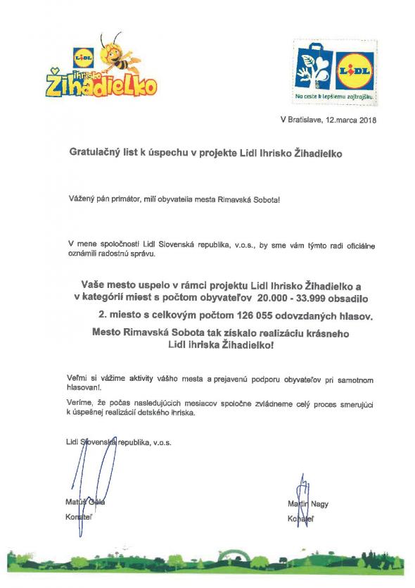 Jedno z detských ihrísk Žihadielko, o ktoré súťažili tisícky ľudí, má byť postavené v Rimavskej Sobote. Po viac ako mesiac trvajúcom hlasovaní a následnom vyhodnocovaní dnes prišiel samospráve gratulačný list, ktorý zverejnili na svojej internetovej stránke. „Vaše mesto uspelo v rámci projektu Lidl ihrisko Žihadielko,“ informujú v liste zástupcovia spoločnosti Lidl. Rimavská Sobota tak podľa nich obsadila vo svojej kategórii druhé miesto s celkovým počtom odovzdaných hlasov 126 055. „Veríme, že počas nasledujúcich mesiacov zvládneme celý proces smerujúci k úspešnej realizácii detského ihriska,“ dodávajú. Nové moderné a bezpečné detské ihrisko má byť v hodnote 87-tisíc eur postavené v Mestskej záhrade, v blízkosti bývalej pláže.