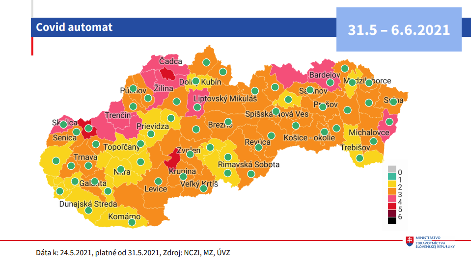 Väčšina okresov na Slovensku bude od pondelka 31. mája patriť medzi tie lepšie, čo znamená, že už vo vyše 60 okresoch v interiéri nebude nutné mať respirátor, ale len rúško, a zákazníci reštaurácií sa budú môcť najesť aj vo vnútri prevádzky.