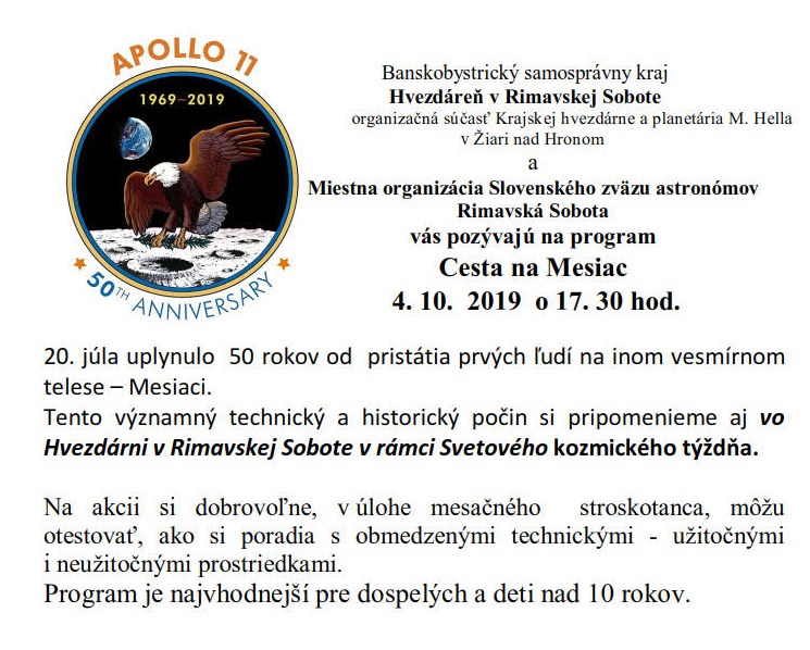 Písal sa 20. júl 1969, kedy človek zanechal prvú stopu na inom vesmírnom telese akou je planéta Zem. Od toho momentu, keď jeden z členov posádky Apollo 11, Neil Armstrong, urobil na Mesiaci prvý krok ubehlo už 50 rokov. A toto výročie si pripomenú v rámci Svetového kozmického týždňa aj v rimavskosobotskej Hvezdárni v piatok 4. októbra od 17:30 hod. zaujímavým programom.