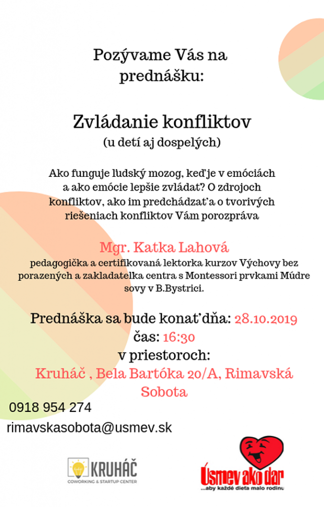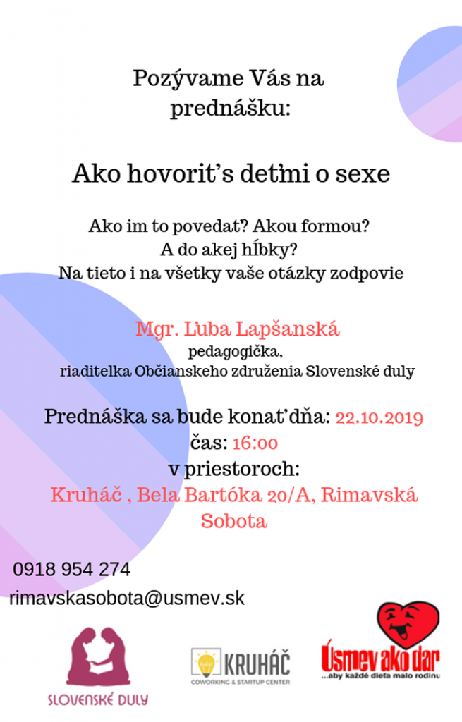 Ako sa s deťmi rozrpávať o sexe a ako zvládať konflikty (u detí aj dospelých)? Príďte sa pozrieť na dve októbrové prednášky na Kruháči, na Ulici B. Bartóka v Rimavskej Sobote. Prednášky sú zadarmo a podľa organizátorov z Komunitného centra Úsmev ako dar v Rimavskej Sobote ide o ďalšiu z prednášok, ktorá je určená všetkým rodičom, starým rodičom, pedagogickým aj nepedagogickým pracovníkom s deťmi a mládežou, ale aj všetkým tým, ktorých zaujíma, čo sa v deťoch odohráva a ako sa s nimi rozprávať o rôznych zložitých témach či situáciách.