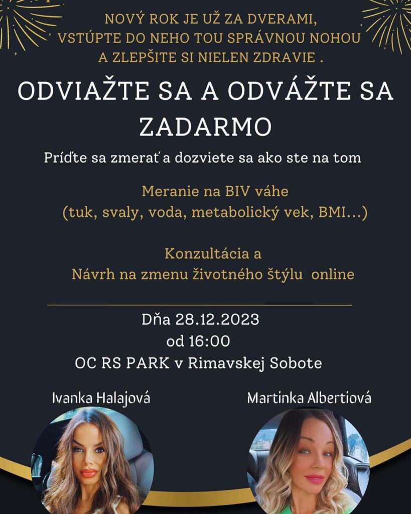 Nutričné poradkyne Ivana Halajová a Martina Albertiová vás 28. decembra pozývajú do priestorov OC RSPark, kde vám na BIV váhe zmerajú hodnotu tukov, svalov, vody, BMI a tiež metabolický vek.