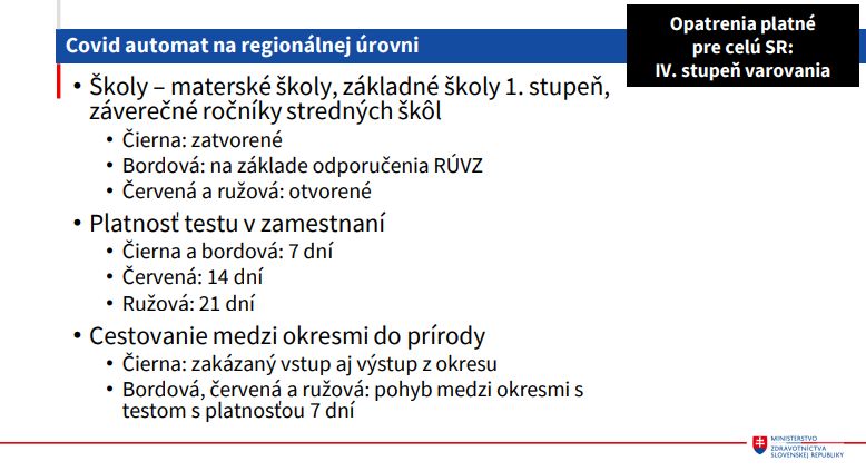 Naďalej platí, že školy ostávajú zatvorené v čiernych okresoch a v bordových o otváraní rozhodnú príslušné RÚVZ. Test na cestu do práce bude potrebný v čiernych a bordových okresoch od stredy 10. februára. Zamestnanci v čiernych a bordových okresoch budú potrebovať 7 dňový test, v červených okresoch nesmie byť starší ako 14 dní a v ružových okresoch 21 dní. Zároveň platí, že v červených a ružových okresoch bude treba test až od 15. februára.