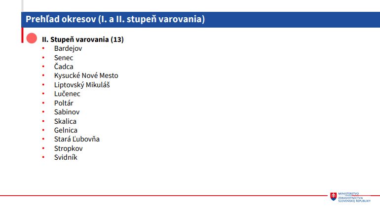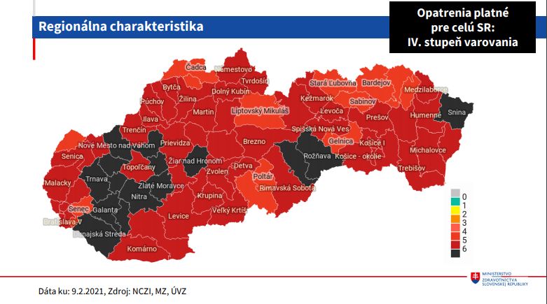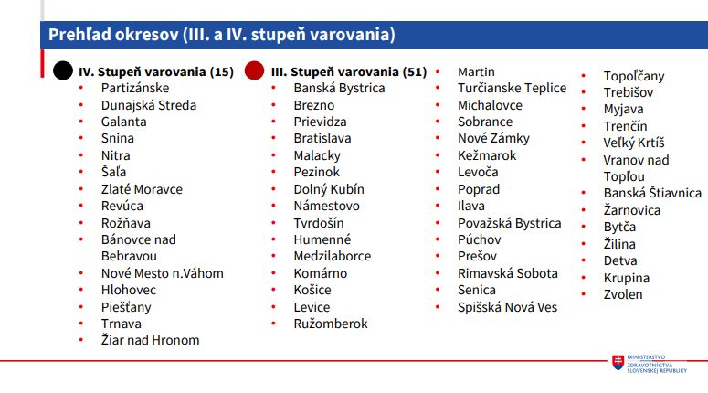 Slovensko ostáva naďalej v čiernej fáze. „Vo väčšine prípadov Slovenska máme bordovú farbu, III. stupeň varovania,“ vyjadril sa minister zdravotníctva Marek Krajčí. 15 okresov je čiernych, 51 bordových a 13 červených. Ani jeden okres už nie je v ružovej farbe. Veľký Krtíš si z ružovej pohoršil do bordovej. Okres Rimavská Sobota na základe epidemiologickej situácie preradili z červenej do bordovej fázy. Okres Revúca ostal v čiernej zóne, okresy Lučenec a Poltár v červenej.