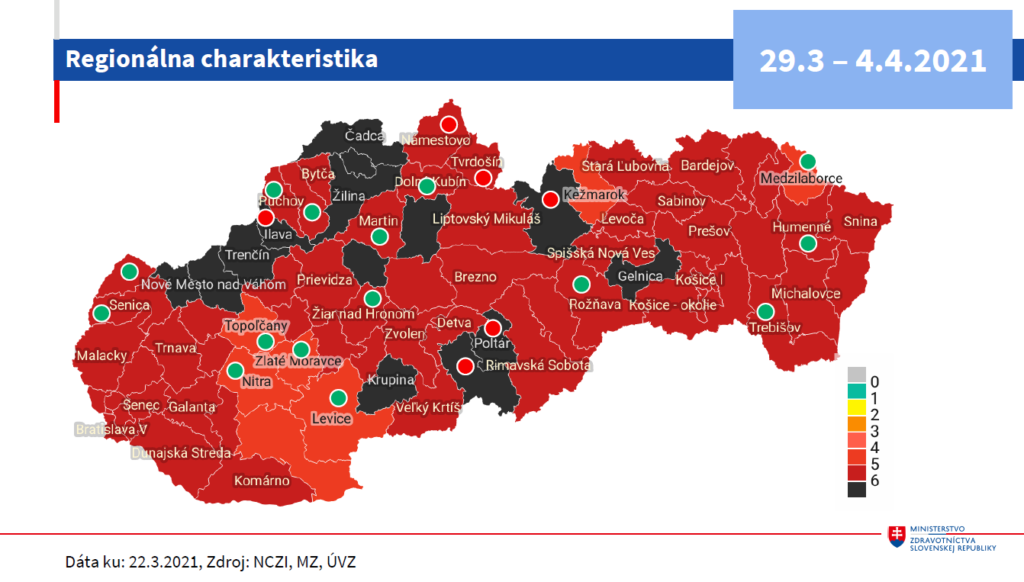 Čo sa týka regionálneho rozdelenia z hľadiska COVID automatu, čiernych okresov bude od pondelka 29. marca dokopy 14, teda o šesť menej ako v súčasnosti. Najviac, 58, bude bordových a sedem červených.
