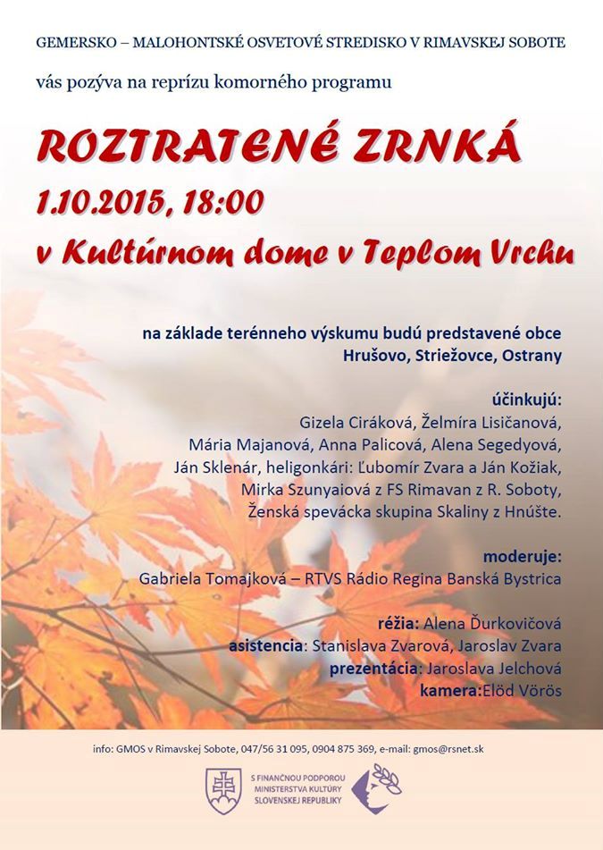 perex-akcieDivadlo, súťaže vo varení, výstava drobných zvierat, beseda so spisovateľom či ukončenie pastierskej sezóny. To je len pár októbrových podujatí, ktoré si ich organizátori pripravili počas tohtoročnej jesene. Program začína už v prvý októbrový deň.Ako ďalej Rimava.sk informovala manažérka Miestnej akčnej skupiny (MAS) Malohont Miroslava Vargová, vo štvrtok, 1. októbra, sú na výber dve podujatia. „Jedným z nich je komorný program o obciach Hrušovo, Striežovce a Ostrany pod názvom Roztratené zrnká, ktorý začína o 18-tej v kultúrnom dome na Teplom Vrchu. Druhou možnosťou je divadelné predstavenie Láááska v Dome kultúry v Hnúšti o 19-tej,“ uviedla manažérka.