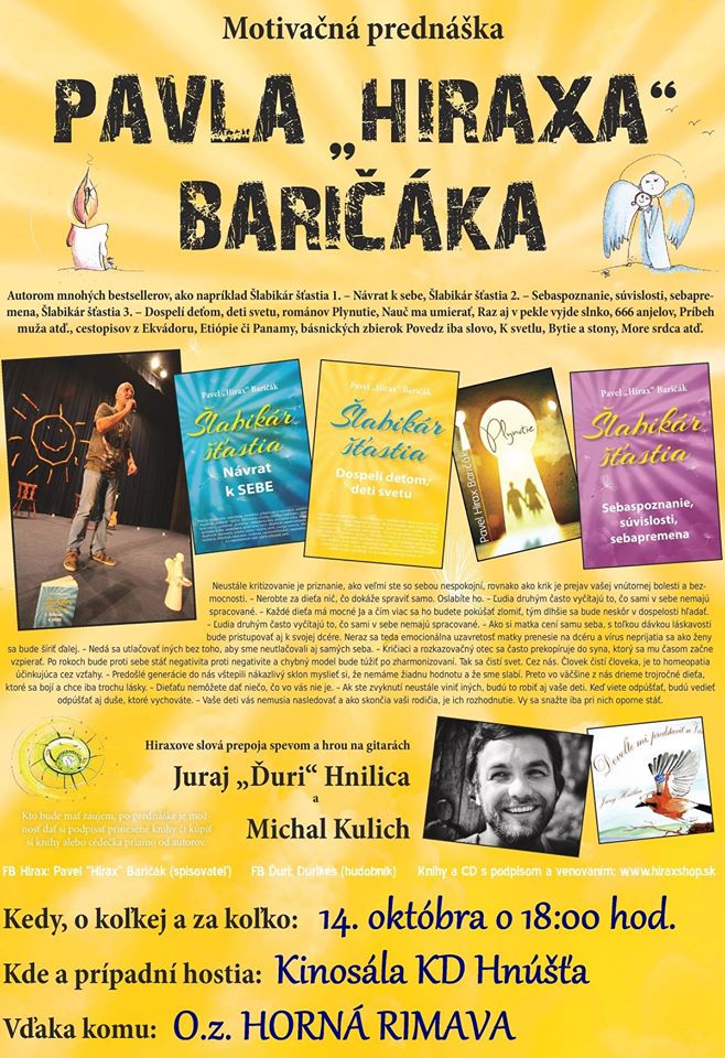 Druhá polovica októbrových podujatí začne v Hnúšti, a to v stredu 14. októbra. Mesto na severe okresu bude podľa manažérky dejiskom motivačnej prednášky spisovateľa Pavla „Hiraxa“ Baričáka, ktorého slová doplnia spevom a hrou na gitarách Juraj „Ďuri“ Hnilica a Michal Kulich.