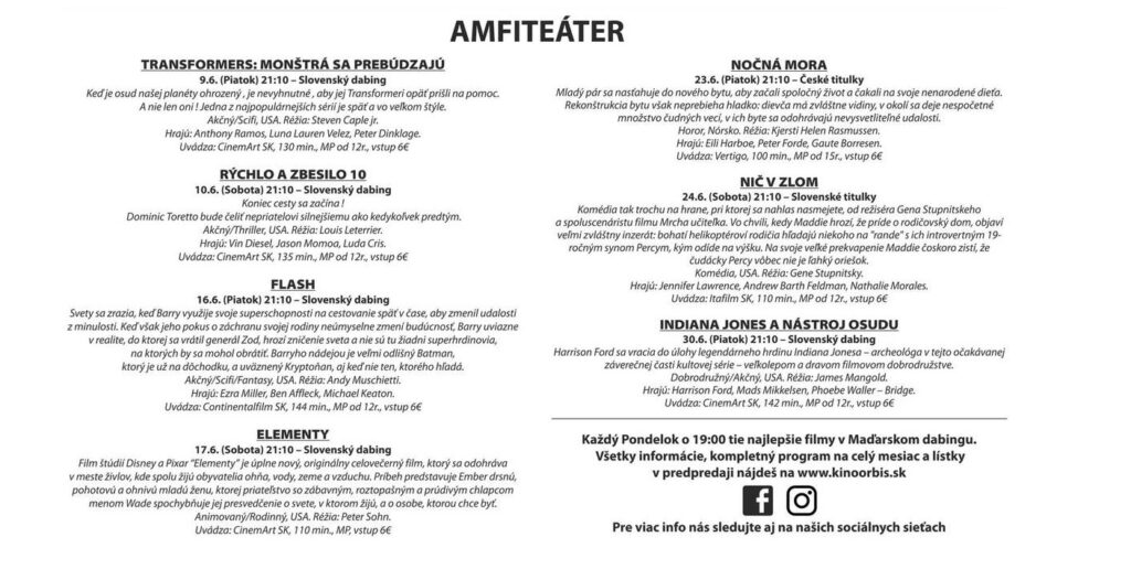 Na amfiteátri si môžete pozrieť napríklad akčnú novinku Transformers: Monštrá sa prebúdzajú (9. 6.). Milovníci áut, adrenalínu a hudby si môžu vychutnať nové Rýchlo a Zbesilo 10 (10. 6.). Ak preferujete fantasy, poteší vás nový Flash (16. 6.) z dielne DC Entertainment. Ak máte chuť na niečo animované, pripravený bude pre vás film Elementy (17. 6.). V ponuke sa tiež nachádza horor Nočná mora (23. 6.), komédia Nič v zlom (24. 6.) či dobrodružný film Indiana Jones a Nástroj osudu (30. 6.).