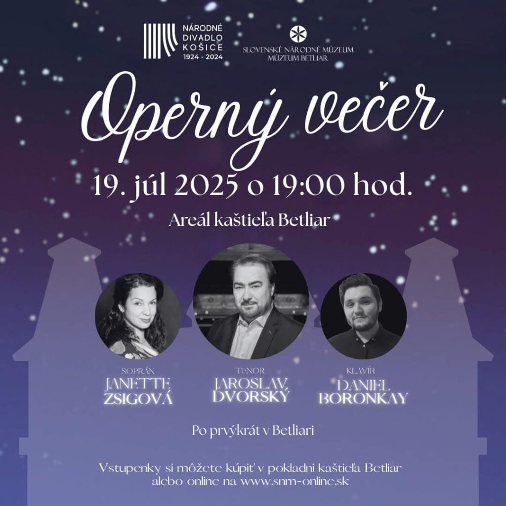V sobotu, 19. júla 2025 sa pred historickým kaštieľom Betliar uskutoční výnimočné kultúrne podujatie. Slovenské národné múzeum – Múzeum Betliar v spolupráci s Národným divadlom Košice pripravili Operný večer pod holým nebom, ktorý sľubuje nezabudnuteľný hudobný zážitok v čarovnej atmosfére letnej noci. V čarovnom prostredí areálu kaštieľa Betliar zaznie výber z najznámejších opier a operiet, ako aj slovenské a talianske piesne, ktoré prinesú návštevníkom neopakovateľný umelecký zážitok.