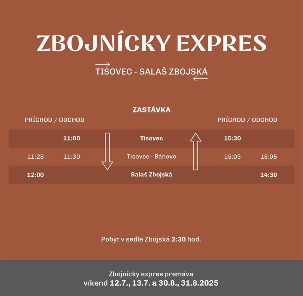 Parný zbojnícky expres premáva počas letných mesiacov v termínoch júl 12. a 13. júl, 30. august a 31. august na trase Tisovec – Zbojská a späť.