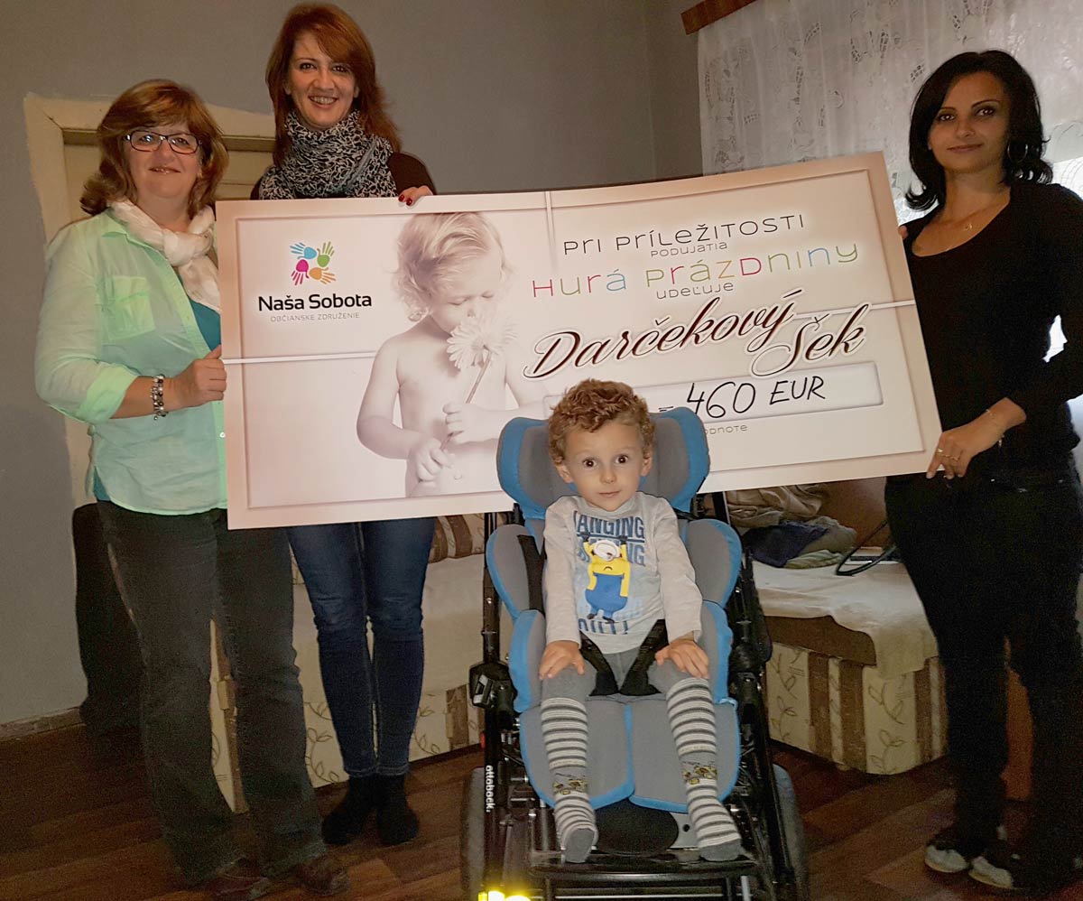 Malému veľkému bojovníkovi Paťkovi spoločne aj s maminou Anetou Bálintovou odovzdali včera, 17. októbra, zástupcovia občianskeho združenia Naša Sobota peniaze z verejnej zbierky, ktorá sa uskutočnila počas júnového podujatia Hurá prázdniny. Trojročný Paťko trpí svalovou atrofiou a vyzbierané financie vo výške 460 eur chce jeho mamina Aneta použiť na zmiernenie jeho choroby.