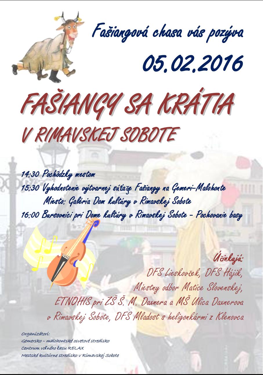 Prichádzajúci piatok bude veselý, ale aj spomienkový. Popoludnie v Rimavskej Sobote bude patriť podujatiu Fašiangy sa krátia a v podvečer si v obci Bottovo môžete pripomenúť národného buditeľa Ľudovíta Štúra v literárno-hudobnom pásme Vzlietli orli vysoko.Ako ďalej Rimava.sk informovala Stanislava Zvarová, metodička pre folklór Gemersko - malohontského osvetového strediska (GMOS) v Rimavskej Sobote, fašiangová chasa bude dobrú náladu prinášať už od 14:30 hod. na pochôdzkach mestom. Podľa jej slov v Galérii Domu kultúry v Rimavskej Sobote, ktorý je s GMOS a CVČ Relax spoluorganizátorom tohto podujatia, bude od 15:30 hod. vernisáž súťaže detí z regiónu pod názvom Fašiangy na Gemeri – Malohonte. „Pred Domom kultúry, vchod od Kauflandu, návštevníkom od 16-tej hodiny fašiangoví bursovníci predstavia žartovné, fašiangové piesne a záver bude patriť pochovaniu basy,“ priblížila Zvarová.