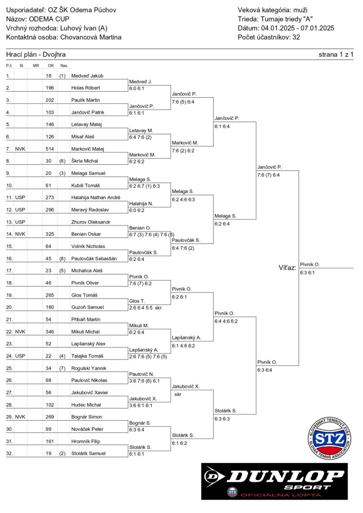 Turnaj sa začínal 4. januára a skončil sa 7. januára 2025. Pivník si vo finále mužov poradil s Patrikom Jančovičom (TK Kúpele Piešťany) a zdolal ho 6:3, 6:1.