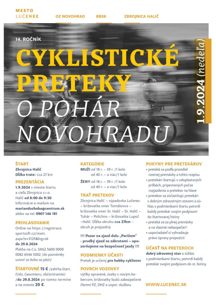 LUČENEC - Začiatok septembra prinesie pre milovníkov cyklistiky dlho očakávanú udalosť. Po ročnej prestávke sa 1. septembra opäť uskutoční tradičný 14. ročník Cyklistických pretekov o pohár Novohradu. Svojím štartom v malebnej obci Halič privíta amatérskych cyklistov, ktorí si zmerajú sily na známom okruhu a zabojujú o titul najrýchlejšieho hobby cyklistu Novohradu.