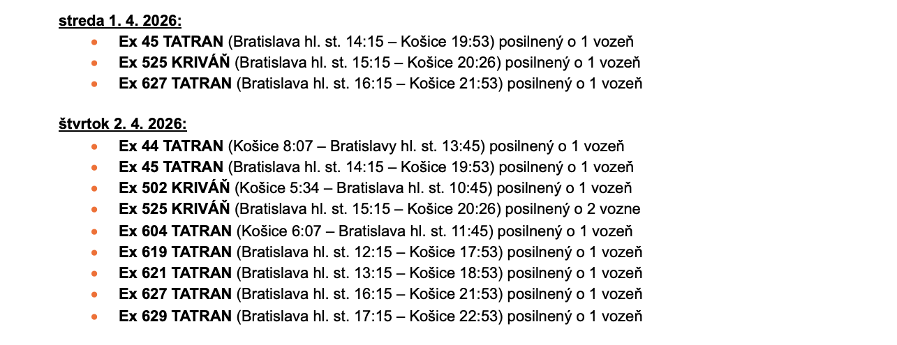 Počas veľkonočného týždňa ZSSK posilní spolu 17 diaľkových expresných vlakov o ďalšie vozne. Ide najmä o pravidelné spoje kategórie TATRAN a KRIVÁŇ, ktoré budú posilnené v najvyťaženejších dňoch – od stredy 1. apríla do pondelka 6. apríla 2026. Niektoré vlaky budú doplnené o jeden, iné až o dva vozne, čím sa zvýši kapacita najmä na smeroch medzi Bratislavou a Košicami.