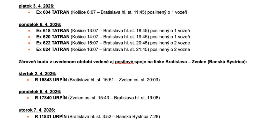 Okrem toho dopravca zaradí aj mimoriadne rýchliky na linke Bratislava – Zvolen – Banská Bystrica. Posilové spoje budú premávať najmä vo štvrtok 2. apríla, pondelok 6. apríla a utorok 7. apríla, čím sa má uľahčiť návrat cestujúcich po sviatkoch.