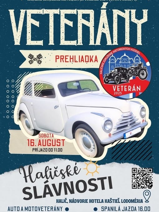 Počas slávností na návštevníkov čaká aj prehliadka historických vozidiel. Naši domáci veteránisti z Haličské združenie historických vozidiel Veterán 2025 pozvali aj svojich veteránových priateľov z iných klubov, takže sa bude určite na čo pozerať. Parkovať budú v areáli starej školy, niekto to pozná ako Teslu, dnes po rekonštrukcii už slúži ako hotel s názvom Kaštieľ Lodoméria.