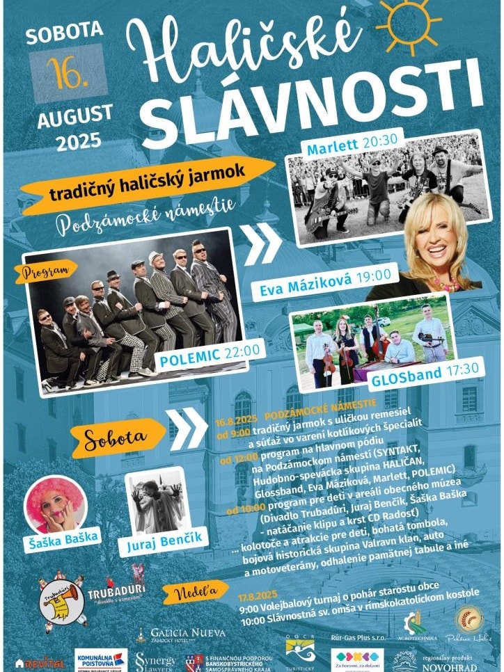 V sobotu 16. augusta 2025 sa totiž centrum obce premení na pestrofarebnú scénu tradičných Haličských slávností. Podzámocké námestie ožije od 9.00 hod. tradičným haličským jarmokom s uličkou remesiel a súťažou vo varení kotlíkových špecialít.