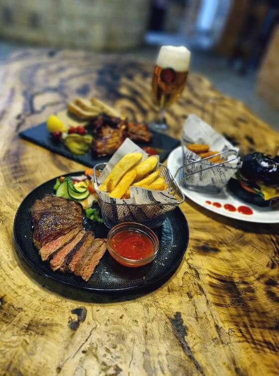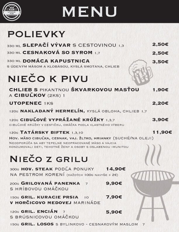 Ponuka z jedálneho lístka je naozaj bohatá. Na chuťovkách, ktoré sa výborne hodia k pivu, na grilovaných špecialitách, tradičných jedlách či hamburgeroch, si môžete zgustnúť každý deň od rána až do večera a v piatok aj do neskorých hodín.