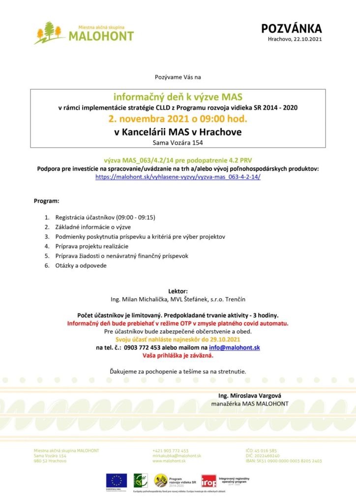Neviete, či je výzva vhodná práve pre vás? Nevyznáte sa v podmienkach výzvy alebo máte nejasnosti? V tom prípade vás MAS Malohont pozýva na informačný deň. Uskutoční sa v utorok 2. novembra 2021 v Kancelárii MAS v Hrachove. Lektorom bude Ing. Milan Michalička z Trenčína. Počet účastníkov je limitovaný, preto je nutné prihlásiť sa. Všetky potrebné informácie nájdete v priloženej pozvánke.