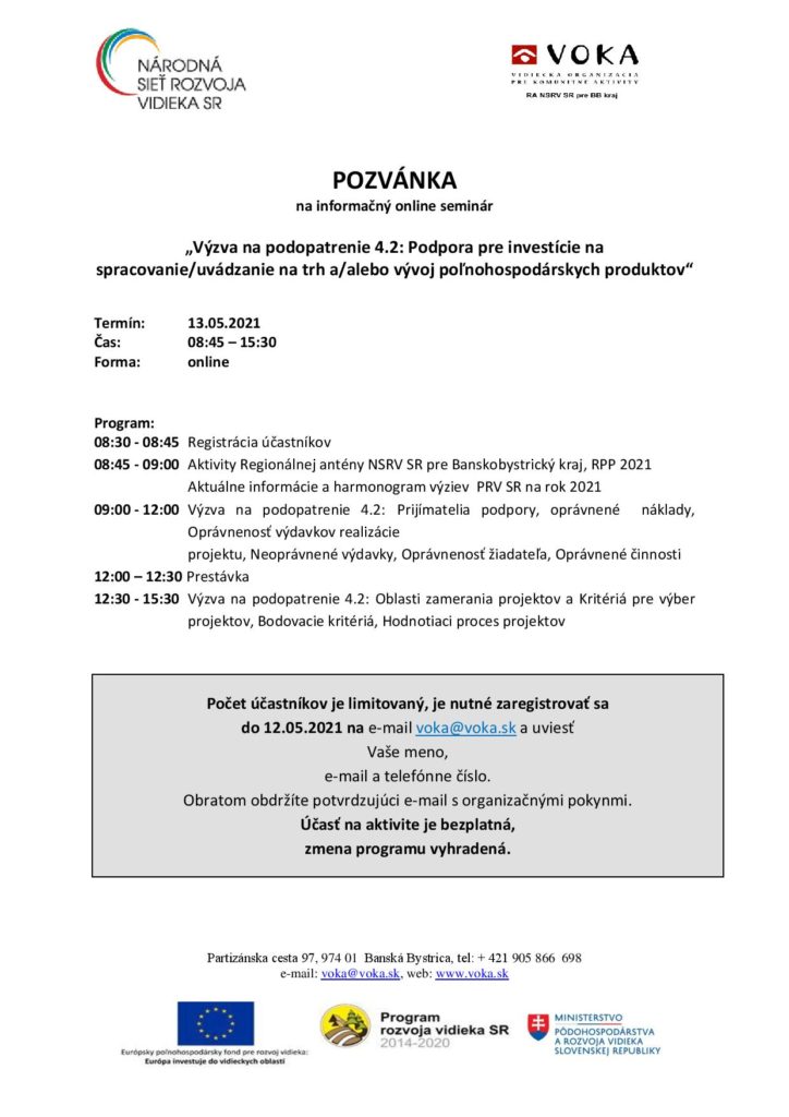 Ak sa chcete o tejto možnosti podpory dozvedieť viac, dávame vám do pozornosti online seminár, ktorý organizuje regionálna anténa NSRV pre Banskobystrický kraj. Témou seminára, ktorý sa koná vo štvrtok 13. 05. 2021 online formou, je výzva na podopatrenie 4.2: Podpora pre investície na spracovanie/uvádzanie na trh a/alebo vývoj poľnohospodárskych produktov.