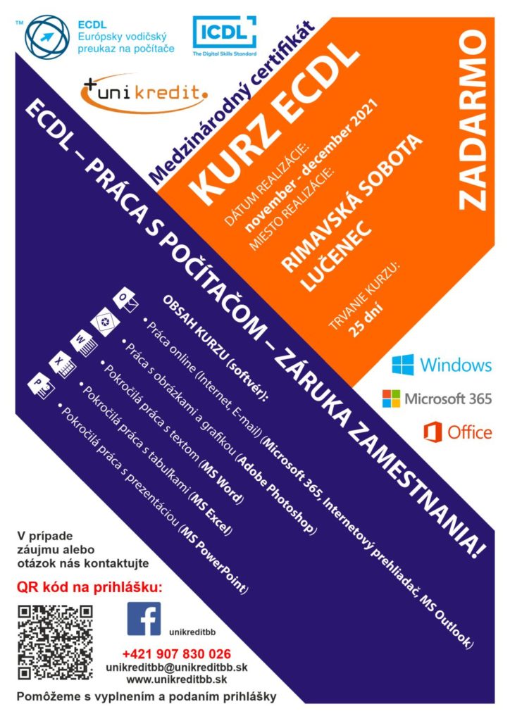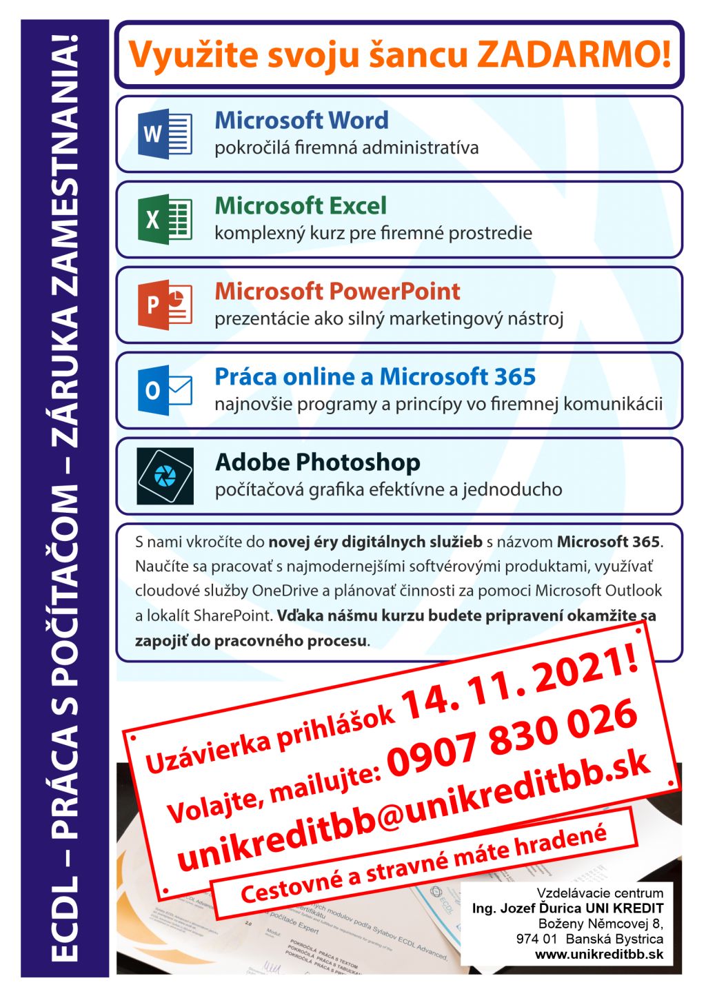 Kurz, v ktorom uchádzači o zamestnanie získajú medzinárodne platný certifikát ECDL, je denný kurz zameraný na vybrané produkty kancelárskeho balíka Microsoft Office, grafický program Adobe Photoshop a nástroje Microsoft 365.