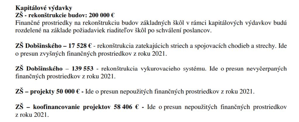 Čo sa týka kapitálových výdavkov, v rozpočte nájdeme položky, ako napríklad 146-tisíc eur na rekonštrukciu domu smútku, osvetlenia a oplotenia v cintoríne, 10-tisíc eur na rozšírenie vnútorného vybavenia kamerového systému mesta a možnosť napojenia ďalších kamier alebo aj 200-tisíc eur na rekonštrukcie budov materských škôl.