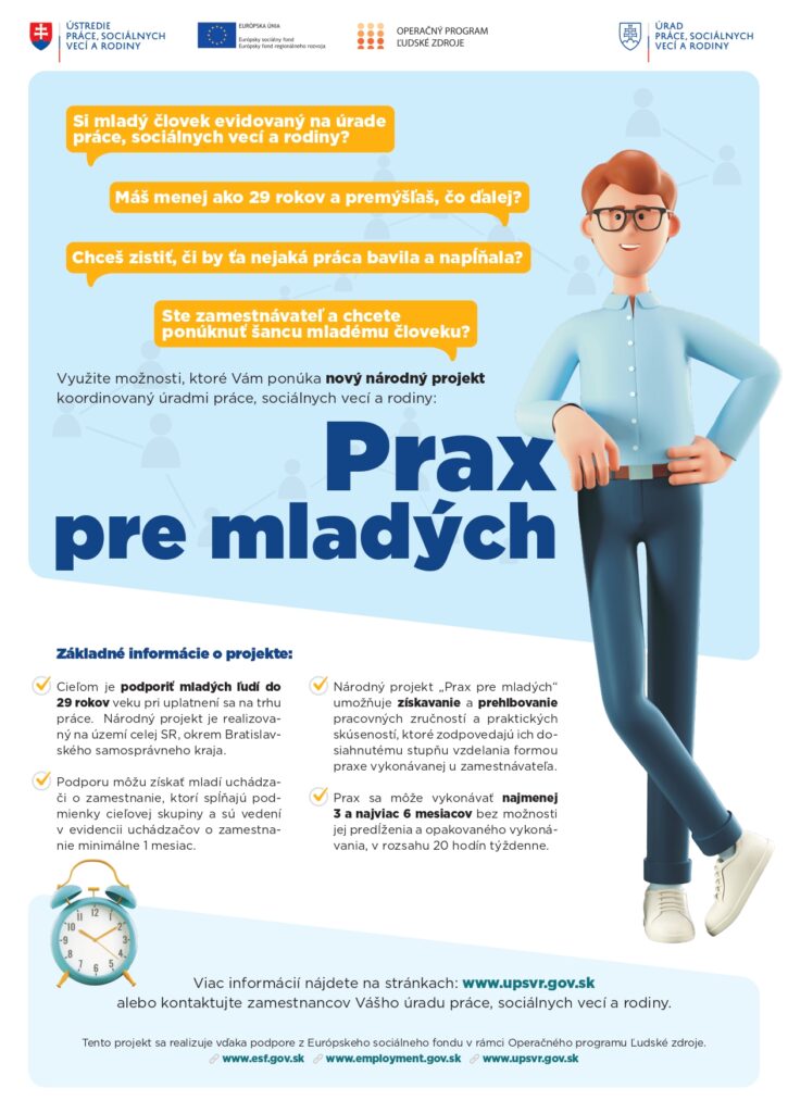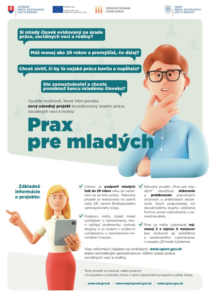 Úrad práce, sociálnych vecí a rodiny dáva do pozornosti využitie možnosti nového národného projektu "Prax pre mladých". Cieľom je podporiť mladých ľudí do 29 rokov pri uplatnení sa na trhu práce.