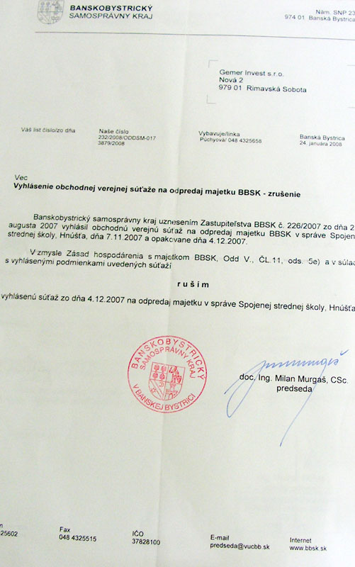 na základe platných podmienok obchodnej verejnej súťaže a v zmysle Zásad hospodárenia s majetkom BBSK. Na otázku, prečo BBSK opätovne neoslovil spoločnosť Gemer Invest a prečo bola nehnuteľnosť predaná priamym predajom, aj napriek dvom predchádzajúcim verejným súťažiam, priamo neodpovedala. Súťaž bola v každom prípade zbytočná (možno niekomu poslúžila ako námet na podnikateľský plán).