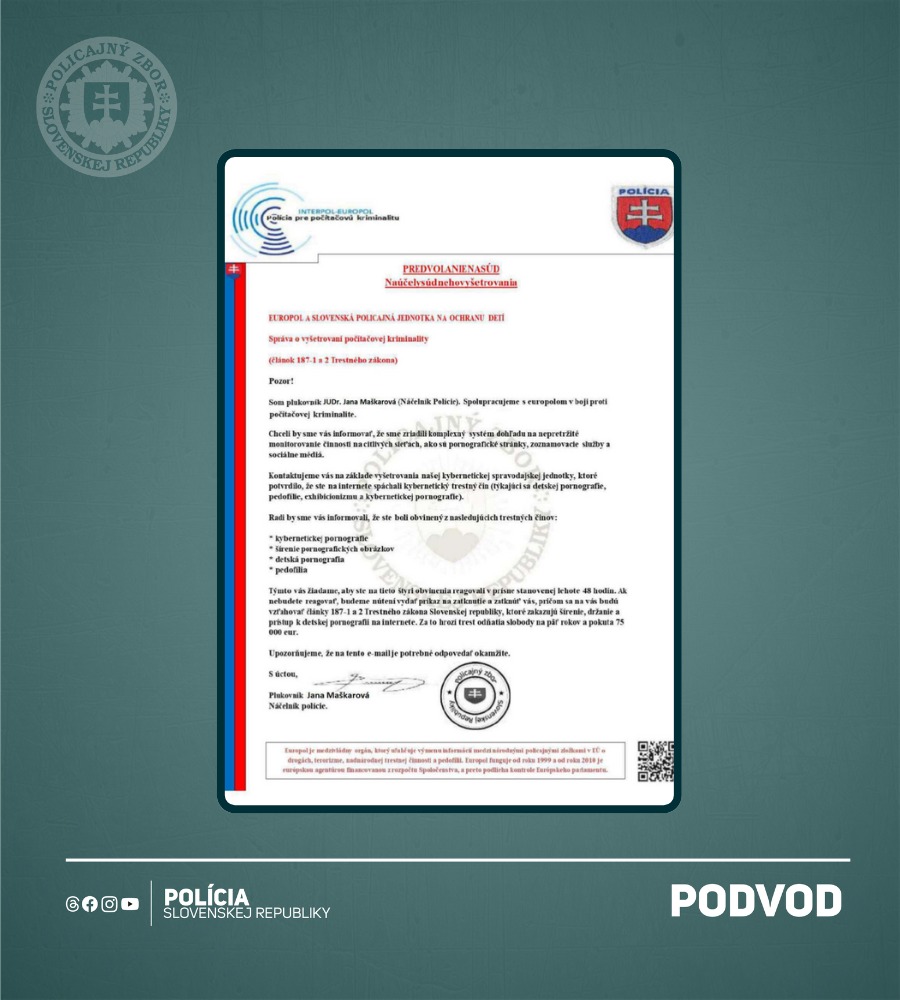 "Policajný zbor si predvoláva osoby výhradne poštou alebo telefonicky, nikdy nie prostredníctvom emailu," zdôrazňuje polícia na svojich sociálnych sieťach. Podvodníci pritom často využívajú nátlak a strach, aby prinútili obete konať unáhlene.