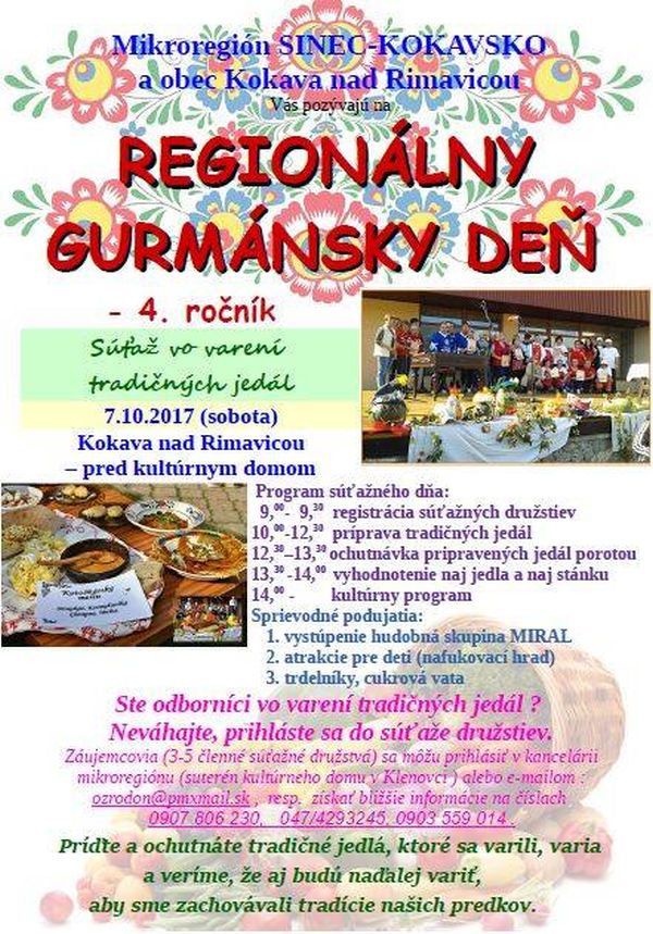 Prvý októbrový víkend začne Regionálnym gurmánskym dňom. Ten sa uskutoční pred Kultúrnym domom v Kokave nad Rimavicou, a to v sobotu, 7. októbra od 9:00 hod. registráciou súťažných družstiev. Tie budú mať za úlohu pripraviť tradičné jedlá našich predkov. Nebude chýbať ani bohatý sprievodný program pre malých i veľkých či sladké potešenie v podobe cukrovej vaty a trdelníkov.