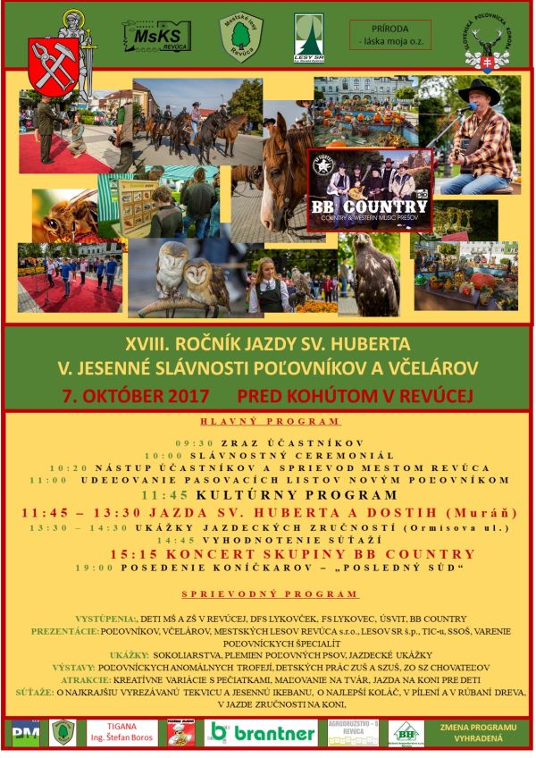 Sobota však bude v Revúcej patriť aj poľovníkom a včelárom. Práve tam sa uskutoční v poradí 18. Jazda Sv. Huberta a 5. Jesenné slávnosti poľovníkov a včelárov. Okrem ukážok jazdeckých zručností sa môžete tešiť na sokoliarov ako aj na ukážky plemien poľovníckych psov. Nebudú chýbať folklórne i spevácke vystúpenia, výstavy, atrakcie či rôzne súťaže. Hlavný program odštartuje o 9:30 hod. Pred budovou kultúrnej pamiatky známej ako Kohút v Revúcej.