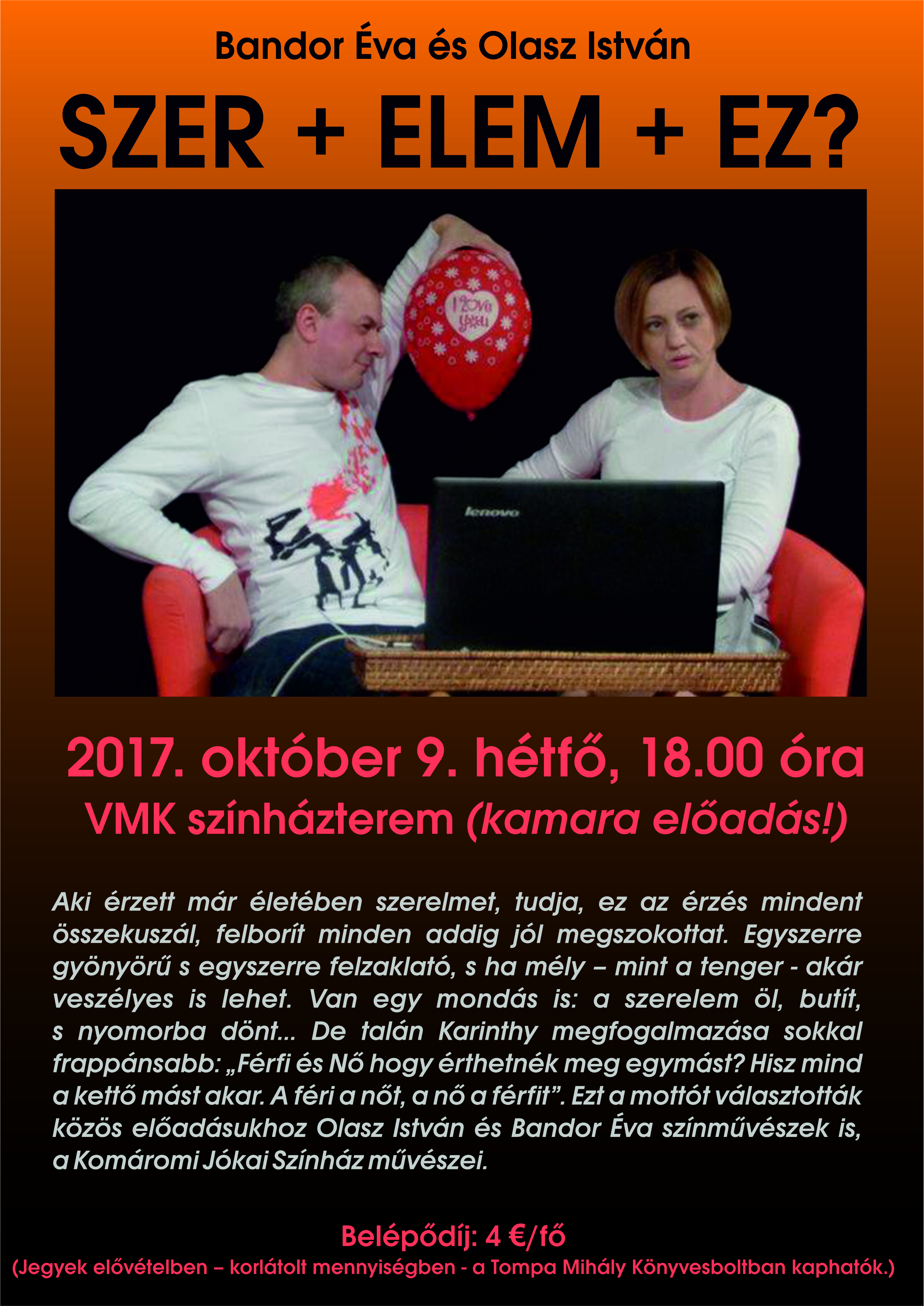 Podujatiam neostane nič dlžná ani Rimavská Sobota. V pondelok, 9. októbra, budú divadelné dosky v Dome kultúry od 18:00 hod. patriť divadlu poézie „Szer+elem+ez?“ v podaní vynikajúcich hercov Jókaiho divadla z Komárna, Évy Bandor a Istvána Olasza. Divadlo zaujímavou a zábavnou formou odkryje rôzne podoby lásky a partnerského vzťahu. Na predstavení odznejú básne Attilu Józsefa, Endre Adyho, Dezsőa Kosztolányiho, Jánosa Pilinského, Dániela Varróa, Jánosa Lackfiho, Arpáda Tótha, Györgya Faludyho, Róberta Labodu a iní.