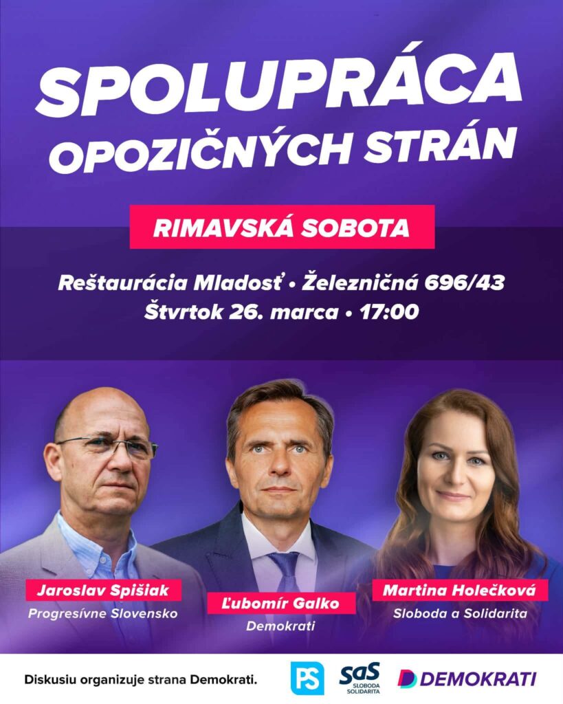 Vo štvrtok 26. marca o 17:00 sa v priestoroch Reštaurácia Mladosť stretnú traja zástupcovia politických strán, aby diskutovali o možnostiach spoločného postupu. Pozvanie prijali Jaroslav Spišiak za Progresívne Slovensko, Ľubomír Galko za Demokrati a Martina Holečková za Sloboda a Solidarita.