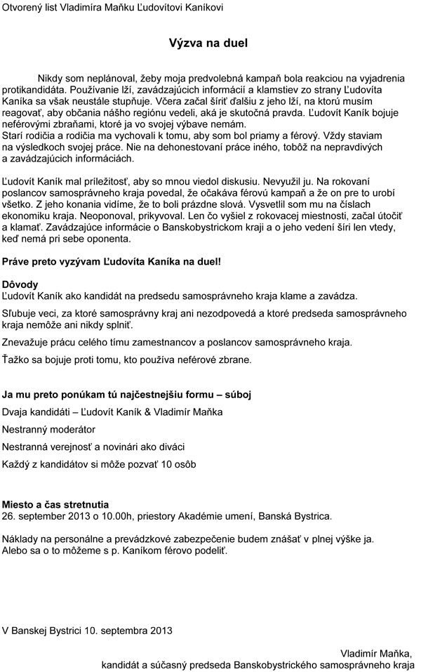 Podľa predsedu Banskobystrického samosprávneho kraja Vladimíra Maňku (SMER-SD) protikandidát na post župana Ľudovít Kaník (SDKÚ-DS) klame, zavádza a bojuje neférovými zbraňami. V otvorenom liste ho preto vyzýva na duel. Ako Maňka vysvetľuje, zavádzajúce informácie o kraji šíri Kaník (poslanec NR SR, pozn, red.) len vtedy, keď nemá pri sebe oponenta. Preto sa s ním chce stretnúť v súboji, s nestranným moderátorom, pred nestrannou verejnosťou a novinármi. Kaník tvrdí, že používa len čísla a fakty z oficiálnych dokumentov, podľa neho sa župan bojí pravdy. Ako pre Rimava.sk potvrdil, výzvu na duel s radosťou prijíma.