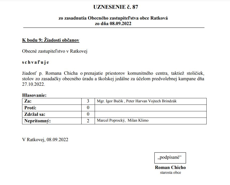Podľa uznesenia obecného zastupiteľstva mal organizátor priestory riadne prenajaté. Išlo o priestory komunitného centra, ale aj stoličky a stoly z obecného úradu a školskej jedálne. Ako sa v uznesení uvádza, išlo o prenajatie „za účelom predvolebnej kampane dňa 27. 10. 2022“. Uznesenie bolo poslancami schválené 8. septembra 2022, starosta ho podpísal.