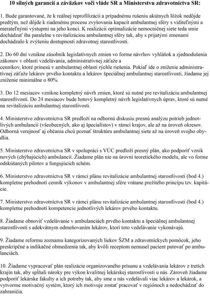 Poslancov zástupcovia memoranda žiadajú, aby proces rokovania o tomto návrhu zastavili. Dožadujú sa, aby poslanci návrh dopracovali a pred prijatím zákona prijali 10 silných garancií a záväzkov voči vláde a ministerstvu zdravotníctva.