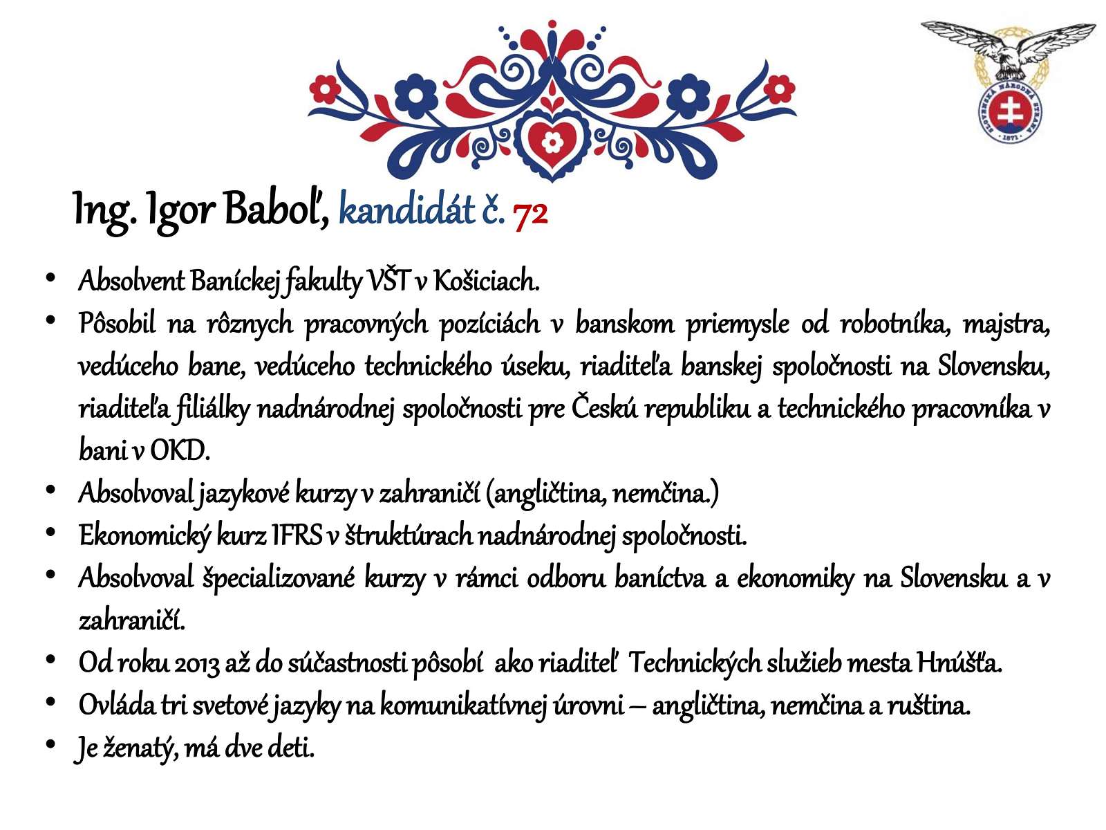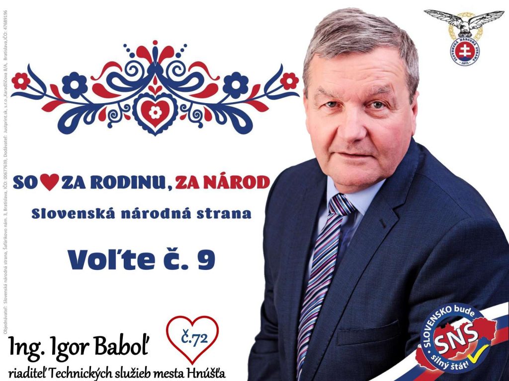 Dlhoročný riaditeľ podľa jeho slov nebol členom žiadnej politickej strany, aj keď po odchode Jána Slotu patril k voličom Slovenskej národnej strany. K zmene u neho prišlo pred pár rokmi, keď sa rozhodol vstúpiť do strany, ktorá ho v nadchádzajúcich voľbách navrhla za kandidáta z nášho regiónu. Ak ste sympatizantom tejto strany, poznáte Ing. Igora Baboľa z Hnúšte, alebo sú vám jeho názory blízke, môžete ho podporiť v parlamentných voľbách do NR SR, ktoré budú v sobotu, 29. februára. Nájdete ho na kandidátke strany SNS, ako kandidáta pod poradovým číslom 72. "Za každý hlas vopred ďakujem," uzavrel.