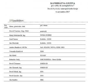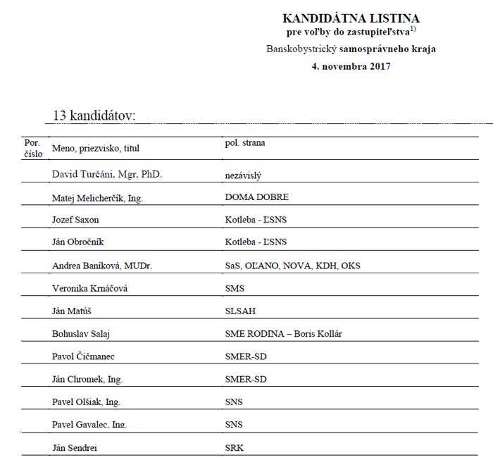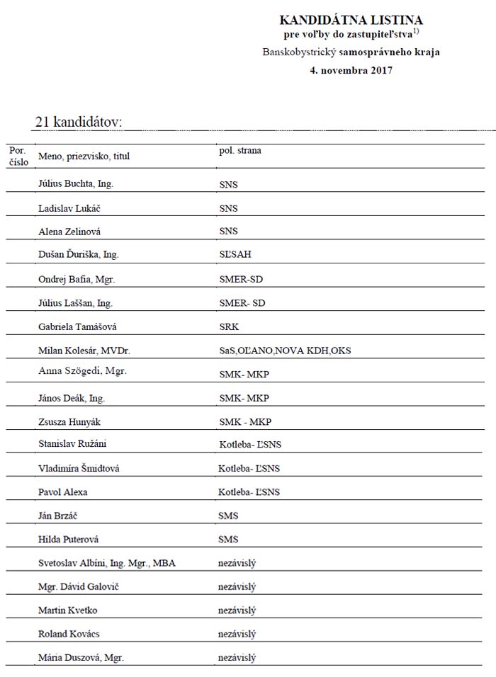 Krajská volebná komisia (BBSK) zaregistrovala všetkých 17 prihlásených kandidátov na predsedu kraja. O kreslo predesdu sa tak uchádza Stanislav Mičev, PhD., Ivan Saktor, Mgr., Alena Pivovarčiová, PhDr., Ján Lunter, Ing., Miroslav Gálik, PaedDr., Michal Kantor, Mgr., Vojtech Kökény, Mgr., Martin Juhaniak, Mgr., Jozef Šimko, JUDr., Viliam Baňák, Ing., Pavel Greksa, Ing., Jozef Sásik, Ing., Zdenek Očovan, Ing., Igor Kašper, Ing., Martin Klus, doc., PhDr., PhD., MBA, Milan Urbáni, MUDr., CSc, MPH, Marian Kotleba, Ing. Mgr.