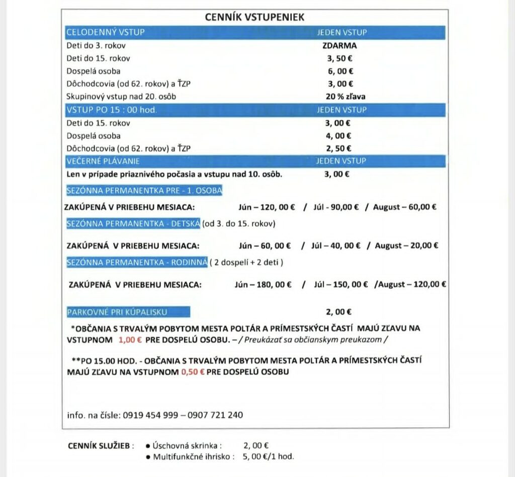 Obyvatelia s trvalým pobytom v Poltári a jeho prímestských častiach môžu využiť zľavu. Po preukázaní sa občianskym preukazom zaplatia o 1,00 € menej (pri vstupe po 15:00 hod. je zľava 0,50 €).
