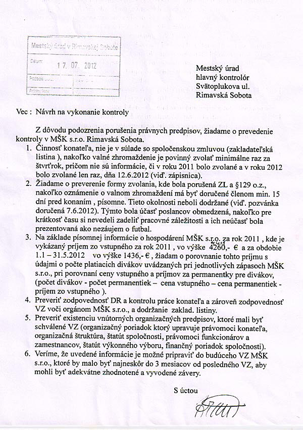 Podľa mňa aj kvôli tejto interpelácii a kvôli prihláške do ďalšej súťaže bolo v júni zvolané zasadnutie valného zhromaždenia. Nemám informácie o tom, že sa za posledné dva roky uskutočnilo, hoci by sa malo zísť každé tri mesiace. Na valnom zhromaždení síce bola predložená správa o hospodárení MŠK, na všetky svoje otázky som ale odpoveď nedostal. Preto som opäť na júnovom rokovaní zastupiteľstva apeloval o písomnú informáciu na interpeláciu. Tentokrát prišla písomná odpoveď, ale nekonkrétna. Rozhodol som sa preto dať podnet hlavnému kontrolórovi, aby preveril činnosť klubu aj postup konateľa Štefana Szánta pri zvolávaní valného zhromaždenia.