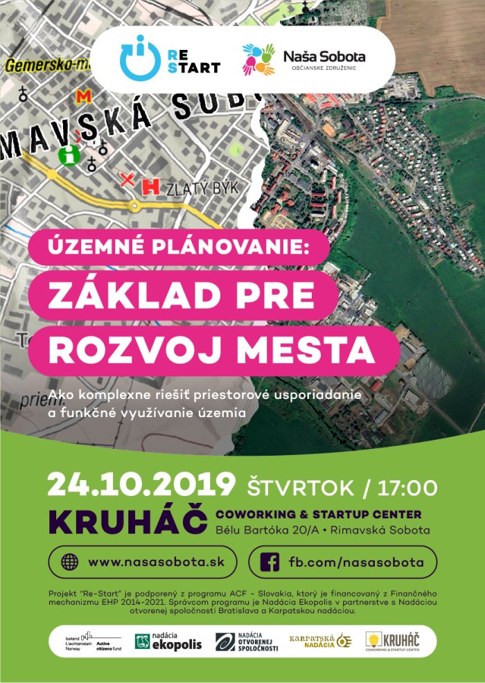 OZ Naša Sobota organizuje už ďalšiu verejnú diskusiu, v rámci projektu Re-Start, na tému územného plánovania. Netušíte, čo je územné plánovanie, čo je jeho úlohou a aké sú jeho časti? Radi vás privítame vo štvrtok 24. októbra 2019 o 17:00 v priestoroch Kruháča, kde sa dozviete ako vyzerá ideálne územné plánovanie a aké sú jeho časti. Časť diskusie bude venovaná aj aktuálnym výzvam v územnom plánovaní Rimavskej Soboty. Naše pozvanie prijali títo zaujímaví hostia: