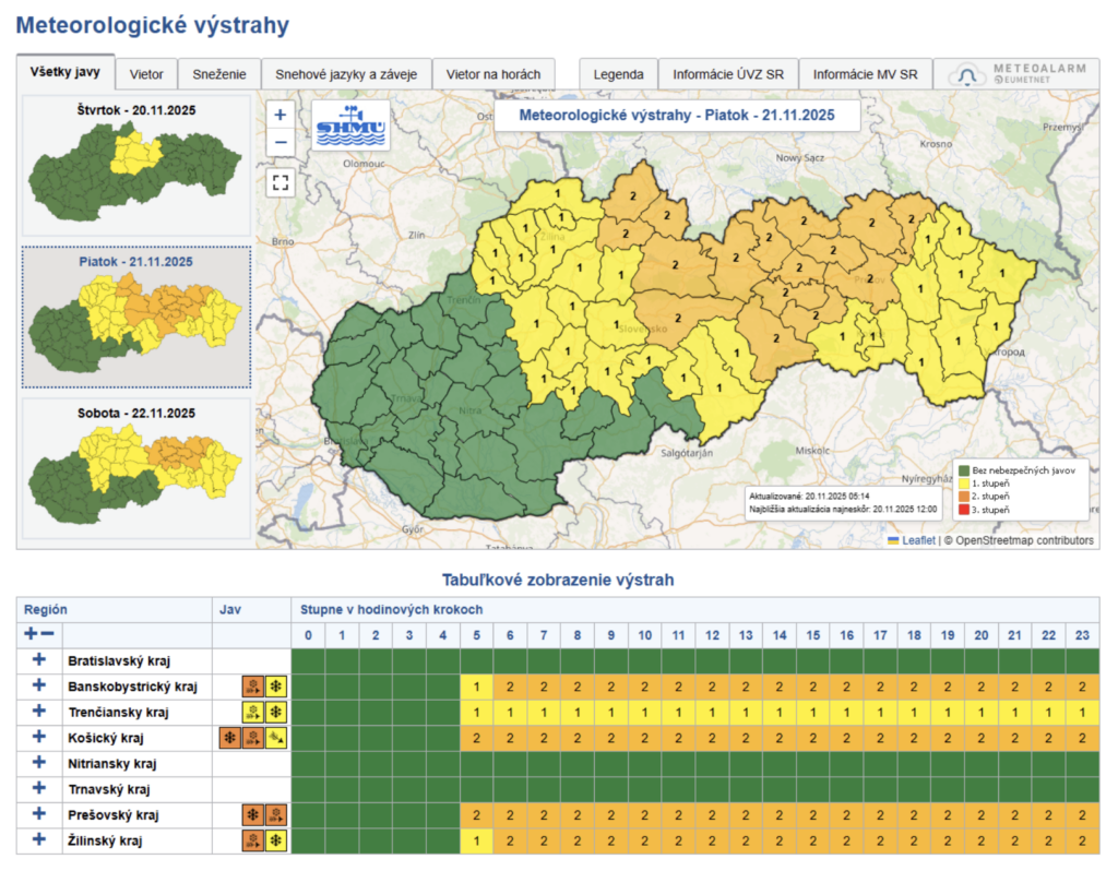 Slovenský hydrometeorologický ústav vydal pre horské oblasti, najmä stredného a východného Slovenska, výstrahu 1. a 2. stupňa pred snežením. Očakáva sa výrazné zhoršenie podmienok na horách: