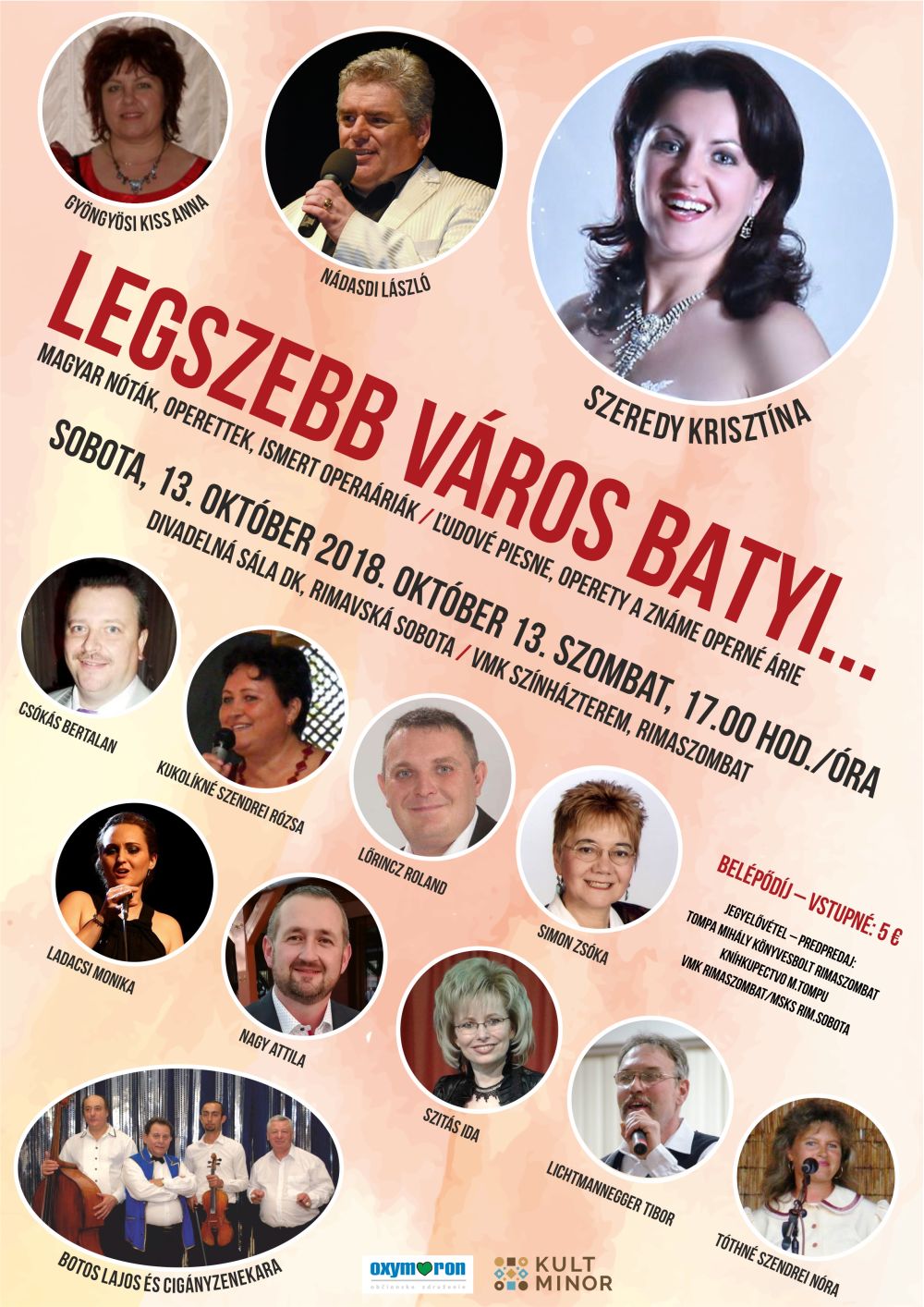 Kultúry nikdy nie je dosť. A tak si pozrite prehľad kultúrnych podujatí, ktoré v mesiaci október, ponúka v Rimavskej Sobote Mestské kultúrne stredisko. Ak ešte nemáte program na dnešné popoludnie (13. 10.), tak o 15.00 hod. sa uskutoční vernisáž výstavy artefaktov z 33. ročníka Letného umeleckého tábora LETAVY 2018. Výstavu si budú môcť záujemcovia prezrieť bezplatne v Galérii Ganevia do konca novembra. Sprístupnená bude počas pracovných dní, v čase od 8.00 – 16.00 hod. V ten istý deň o 17.00 hod. všetkých pozývame do divadelnej sály na galaprogram LEGSZEBB VÁROS BATYI, kde zaznie všetko od ľudových maďarských piesní, cez operety až po opery. V hudobnom galaprograme popri domácich spevákoch, finalistoch celoštátnej súťaže Astra-Őszirózsa vystúpia aj hostia z Maďarska, z televíznej obrazovky a z rozhlasu dobre známe tváre a hlasy: Gyöngyösi Kiss Anna, Nádasdi László a Krisztína Szeredy. Sprevádzať ich bude cigánska kapela Lajosa Botosa. Vstupné: 5€, predaj vstupeniek v MsKS a Kníhkupectve M. Tompu.