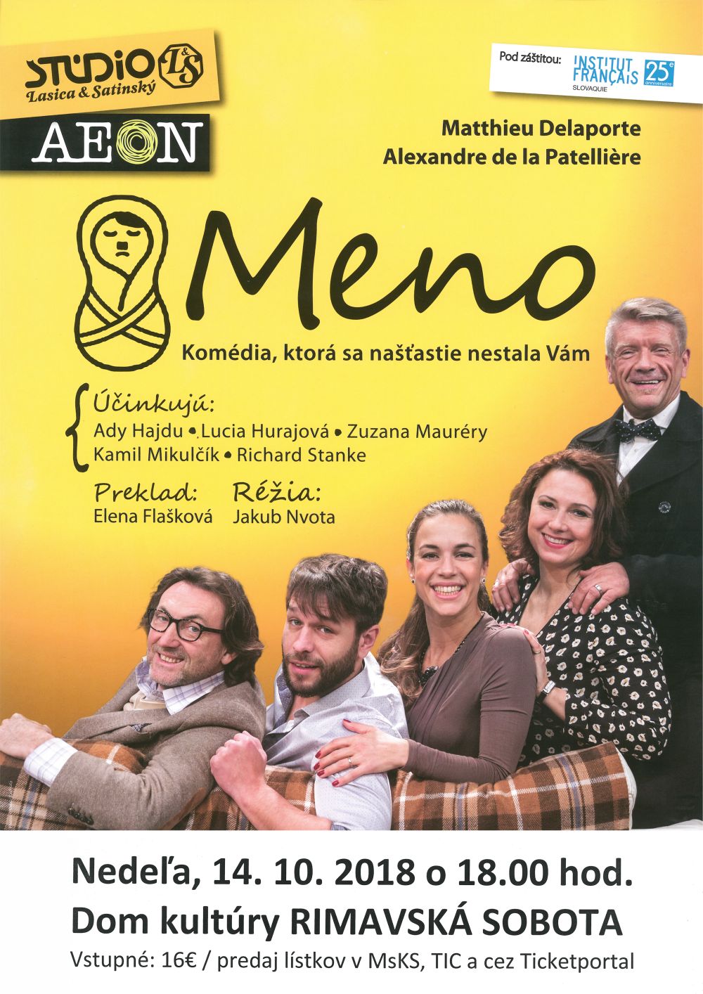 V nedeľu, 14. októbra o 18.00 hod. divadelnú sálu naplnia priaznivci slovenského divadla a humoru. Privítame brilantnú francúzsku komédiu MENO alebo Komédia, ktorá sa našťastie nestala Vám… v podaní hercov Štúdia L+S. Inscenácia vďaka skvelému obsadeniu a mimoriadnemu situačnému humoru zaručene pobaví každého diváka. Ponorte sa do hry na pravdu a zistite, ako jeden večer neľútostnej úprimnosti zamáva s rodinnými aj kamarátskymi vzťahmi. Účinkujú: Zuzana Mauréry, Vladimír Hajdu, Richard Stanke, Lucia Hurajová a Kamil Mikulčík. S hercami ju naštudoval režisér Jakub Nvota. Vstupné: 16€ / predaj vstupeniek v MsKS, TIC a cez Ticketportal.